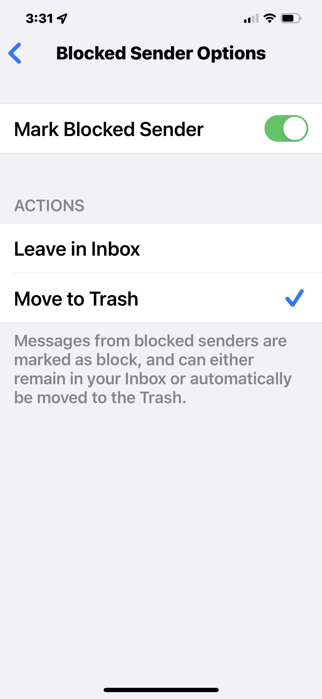 - Move to Trash: Sends the blocked email to the Trash folder. You can empty the trash manually, or choose to have the trash empty automatically in your account settings.