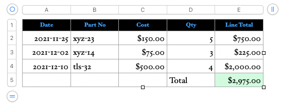 There are two formulas in this table. There is a Line Total formula associated with cell E2 thru E4, and a Line Total Summary located in cell E5.