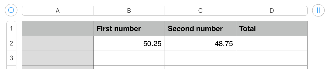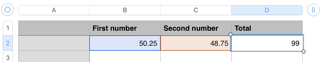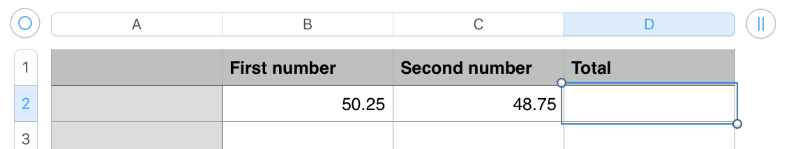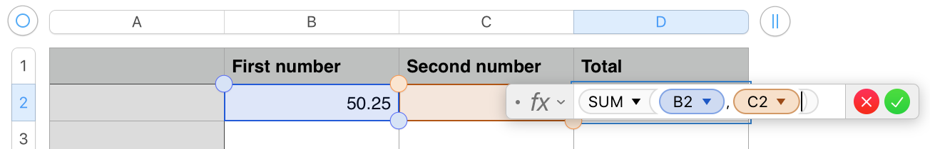 We want to SUM the two values in cells B2 and C2, and display the result in cell D2