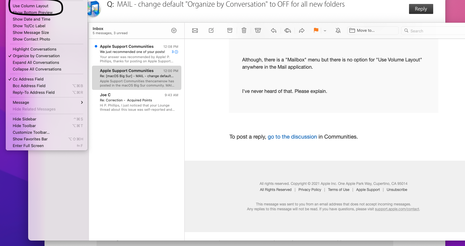 MAIL - change default "Organize by Conversation" to OFF for all new folders