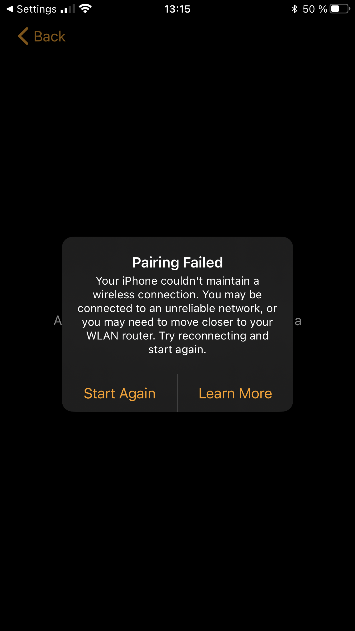 When you try to pair your phone and watch, a notification appears stating "Pair not created. The iPhone has failed to maintain a wireless connection. Perhaps there is not reliable or the device should be placed closer to the WLAN router. Try to re-establish the connection and try again."
