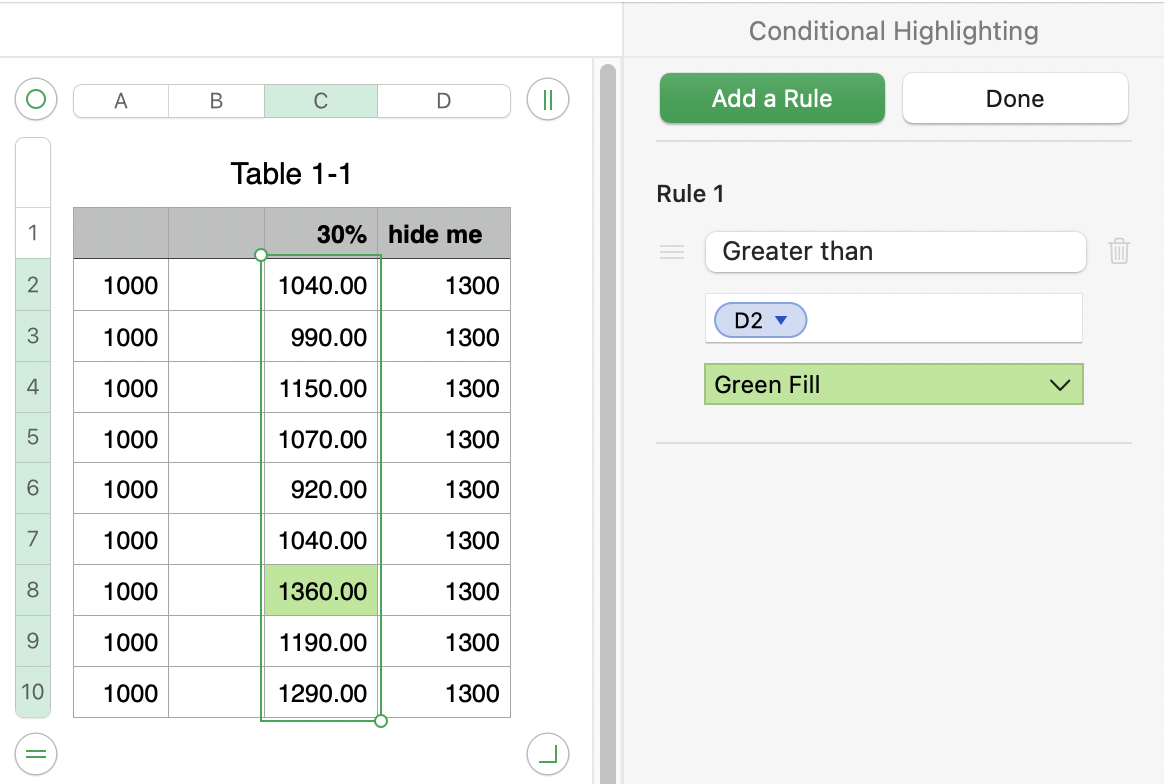 Column C, which will be hidden, contains a formula that adds the specified percentage to the values in the same row of column A, and that the values in Column C will be compared with by the conditional formatting rule applied to that column.