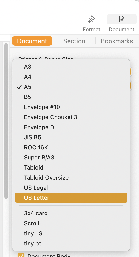 Click the second menu bar (set to A5 above) to open the menu, then select US Letter and release the mouse button.