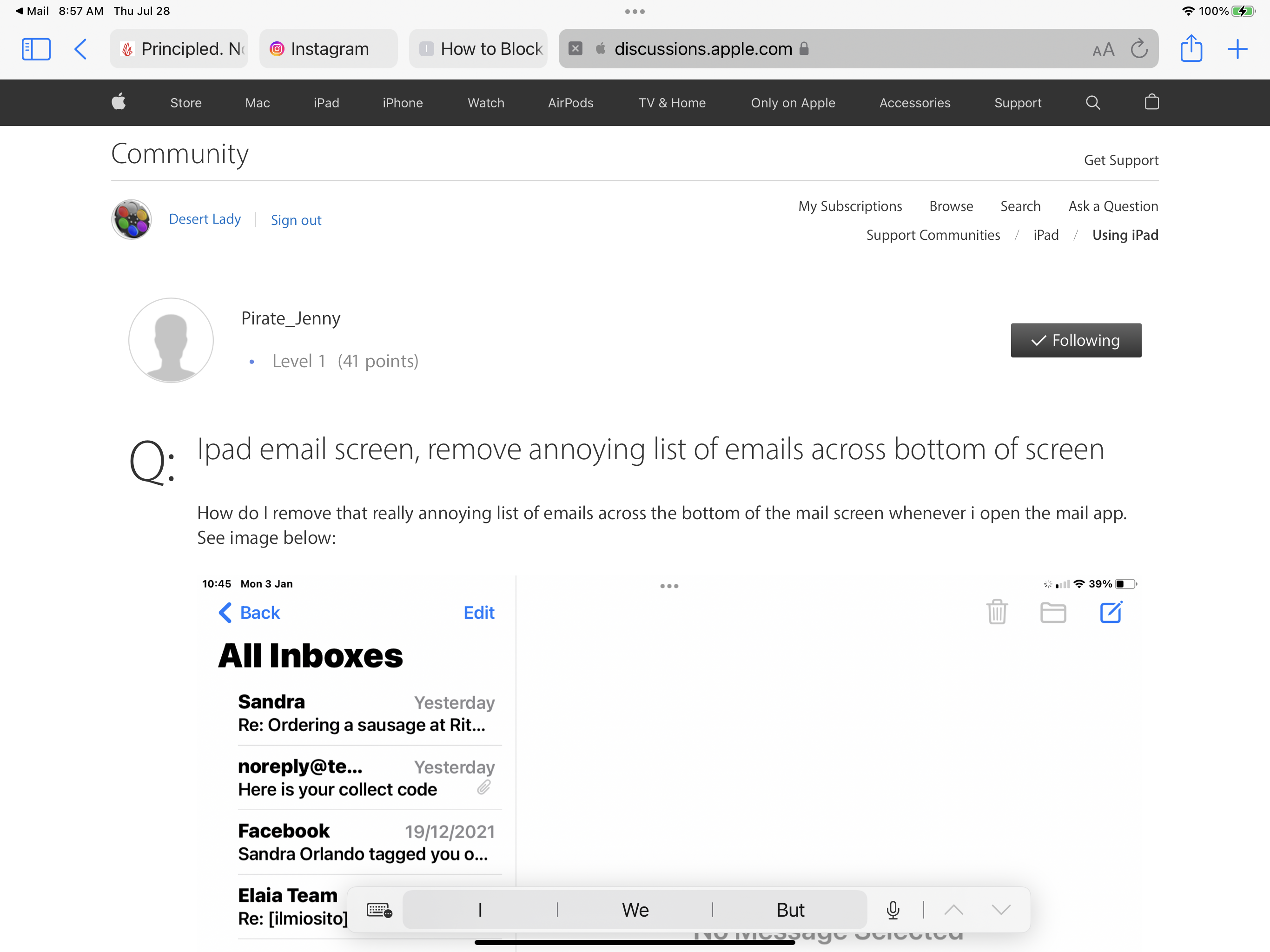 Ipad email screen, remove annoying list of emails across bottom of screen