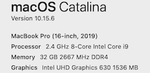 Applesymbolupper left > About this Mac . Mine shows running MacOS 10.15.6, 16 in 2019.