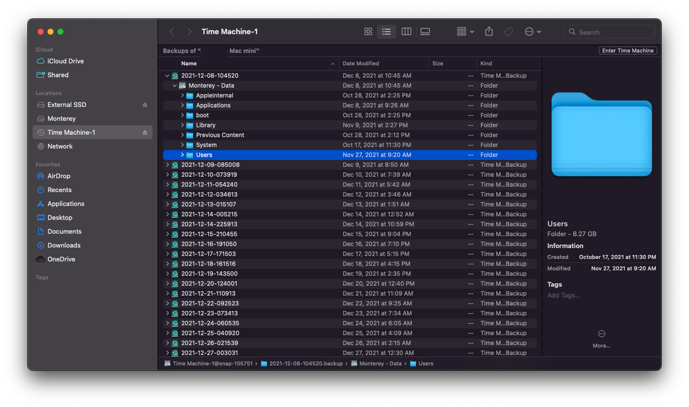 I have a Mac M1 and I have just did a clean install of Monterey, it wen smoothly. However, when I tried to setup the Time Machine to retrieve the backups from the old install, the computer can see the disk but it cannot "see" the Backup file that is there. If I enter Time Machine, it does not show me anything other than today. I believe it may be due to some involuntary name change, but I can't say for sure. Can someone point me the way to do the adjustments to recover the backups I had there?