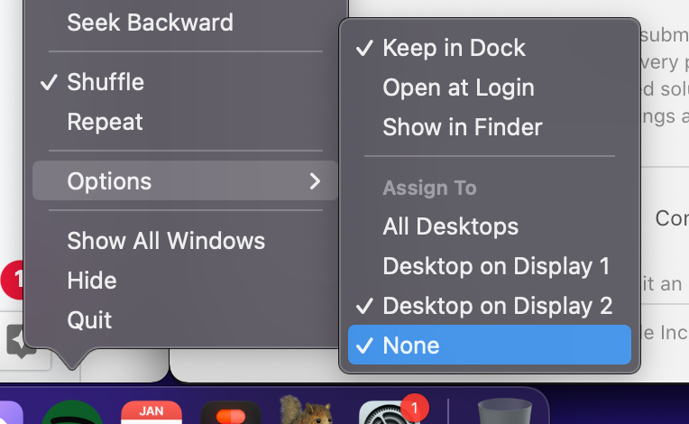 I'm running two displays to my Macbook Pro. The dedicated apps that I'd like to set to my secondary display don't always remember to show up on the selected display. When I right-click on the app in the dock, both "Display 2" AND "None" are selected.