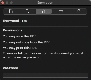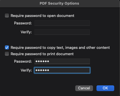 That should be self-explanatory and if the originating application provides that Print… PDF sub-menu it can be done there, or in Preview's PDF sub-menu. Once the now protected PDF is opened in Preview, one can open the Inspector (⌘i) and see that there is now a copy restriction on that PDF: