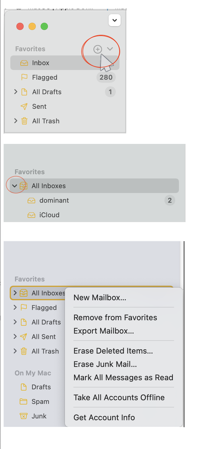 Mine, OTH, has "Favorites" > "Inbox-Gmail" > "Gmail" which is my main Gmail account. The new, separate gmail addy was just inserted at the bottom of the sidebar, below the other various email addies I have. How do I get the sidebar to operate like Apple's example with all inboxes up top?