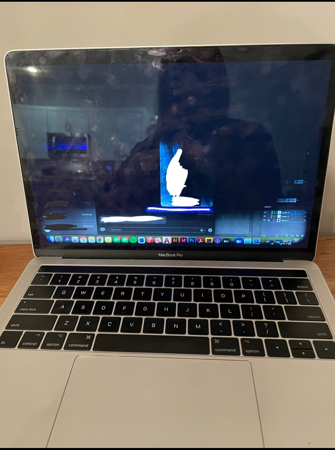 my 2017 MacBook Pro’s display did this when i turned it on one morning. The pixels slowly turned black until the whole screen blacked out. Touch Bar still shows the esc key. (I drew over personal imessages.)