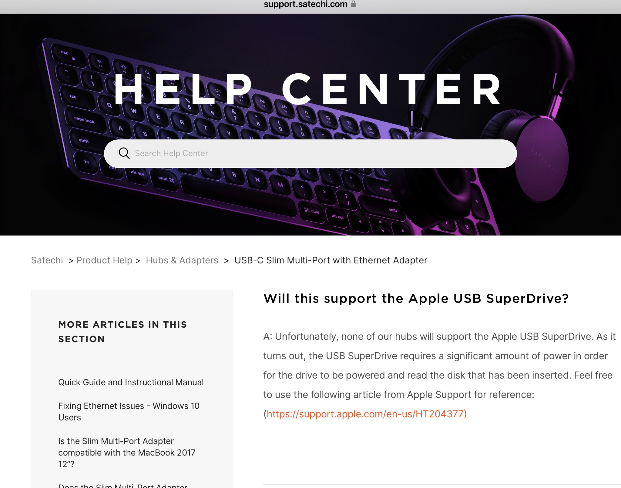I asked Apple customer support whether the USB superdrive would work with my MacBookAir 13'retina 2019. The agent ( through chat) stated that as long as I have an adapter it should. I have a Satechi USB C adapter, purchased through apple as well so I bought the drive. I have tried to use it but a notification states that I should connect it to a USB port as it needs power. I read through the discussions and someone got a better result when he upgraded to Monterey. I did that and it still is not working. Should I return it or is there a way for this to work?