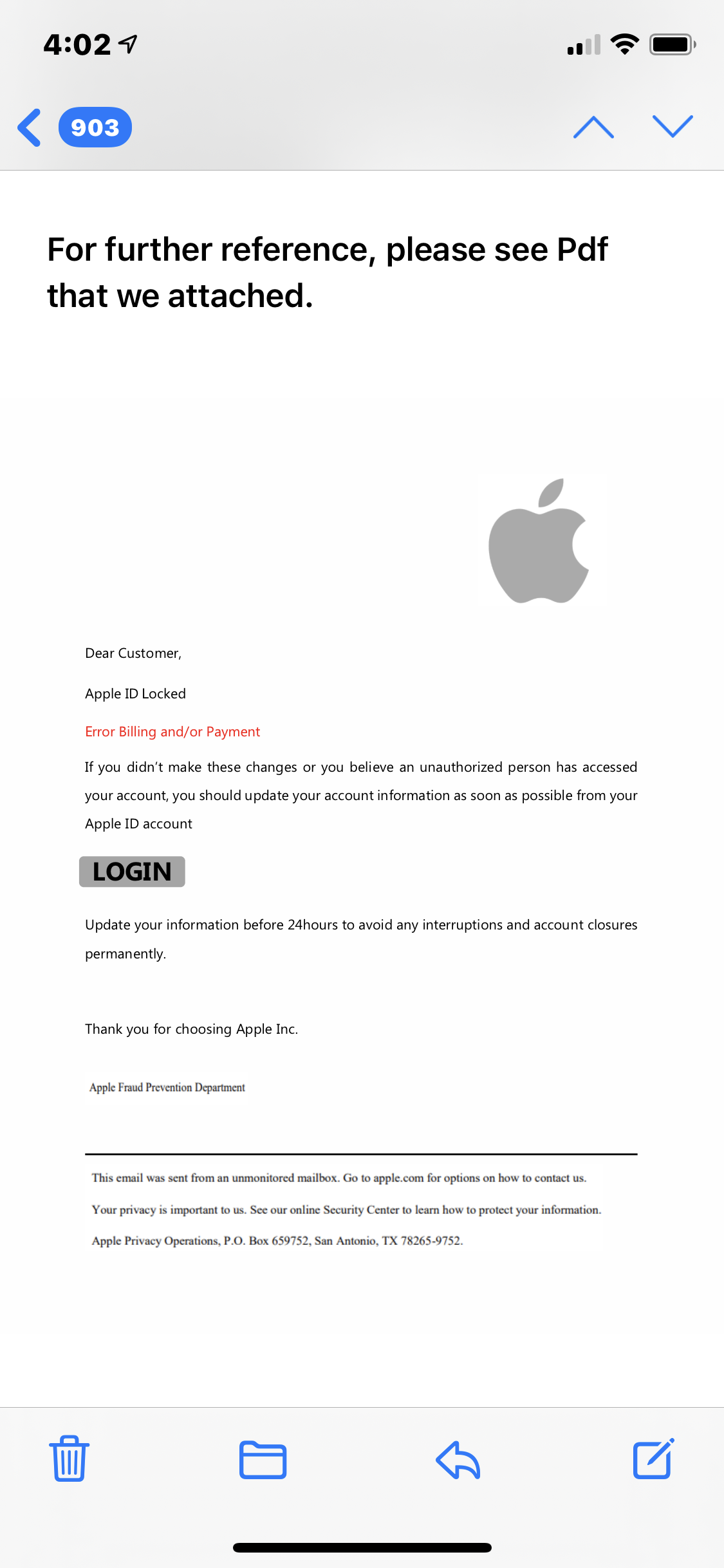 It is a phishing attempt. Do not respond. Do not divulge any personal or financial information. You can use the address below to forward the suspect email message, as an attachment to Apple.