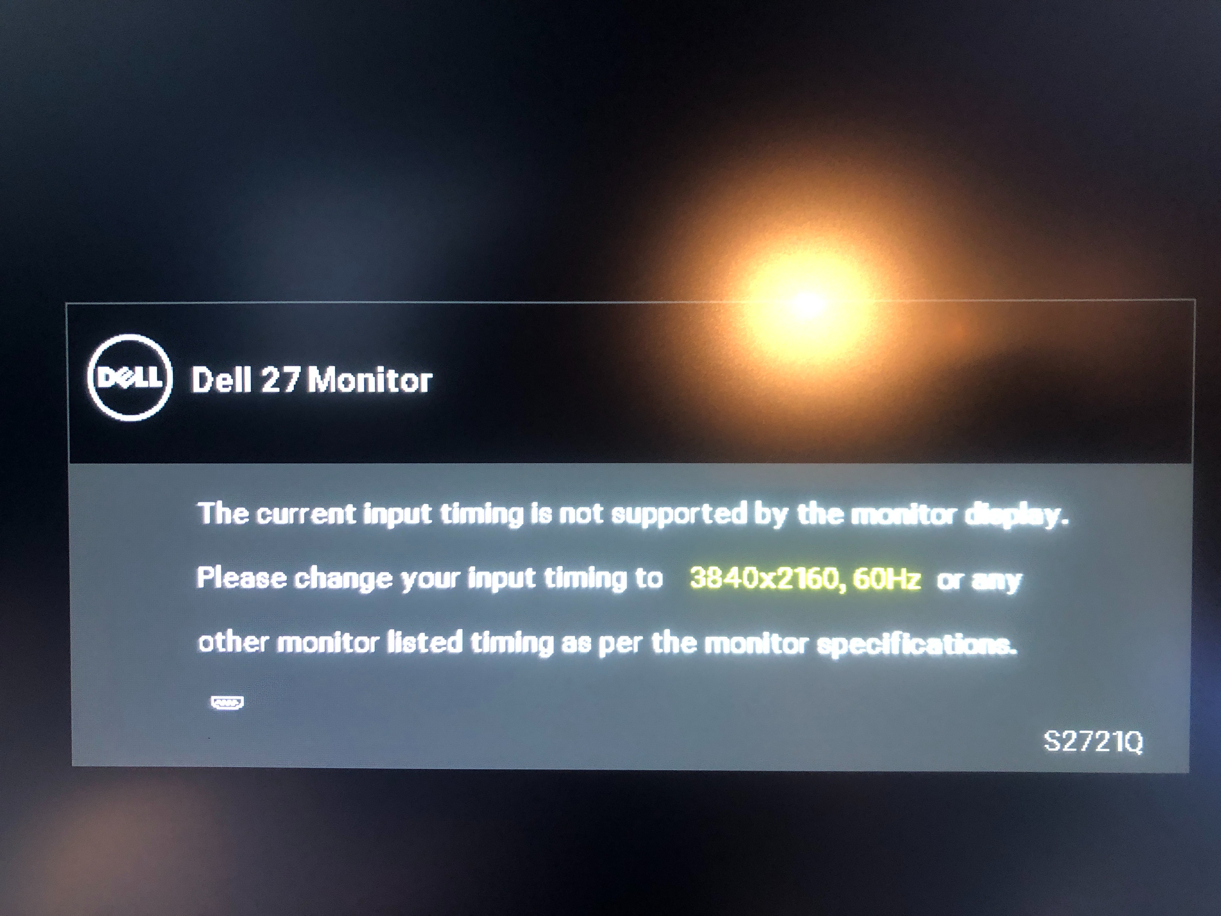 The HDMI-to-USBC connection is the one that does not work. In System Preferences, I see my MBP and the two external monitors appear in the distribution and list of displays but no feed is sent to that second connected monitor. This is the monitor that gives me the error message "the current input timing is not supported by the monitor" (see photo). From time to time, I will briefly get a messed up feed (see other photo) but that will disappear to show the same error message again.