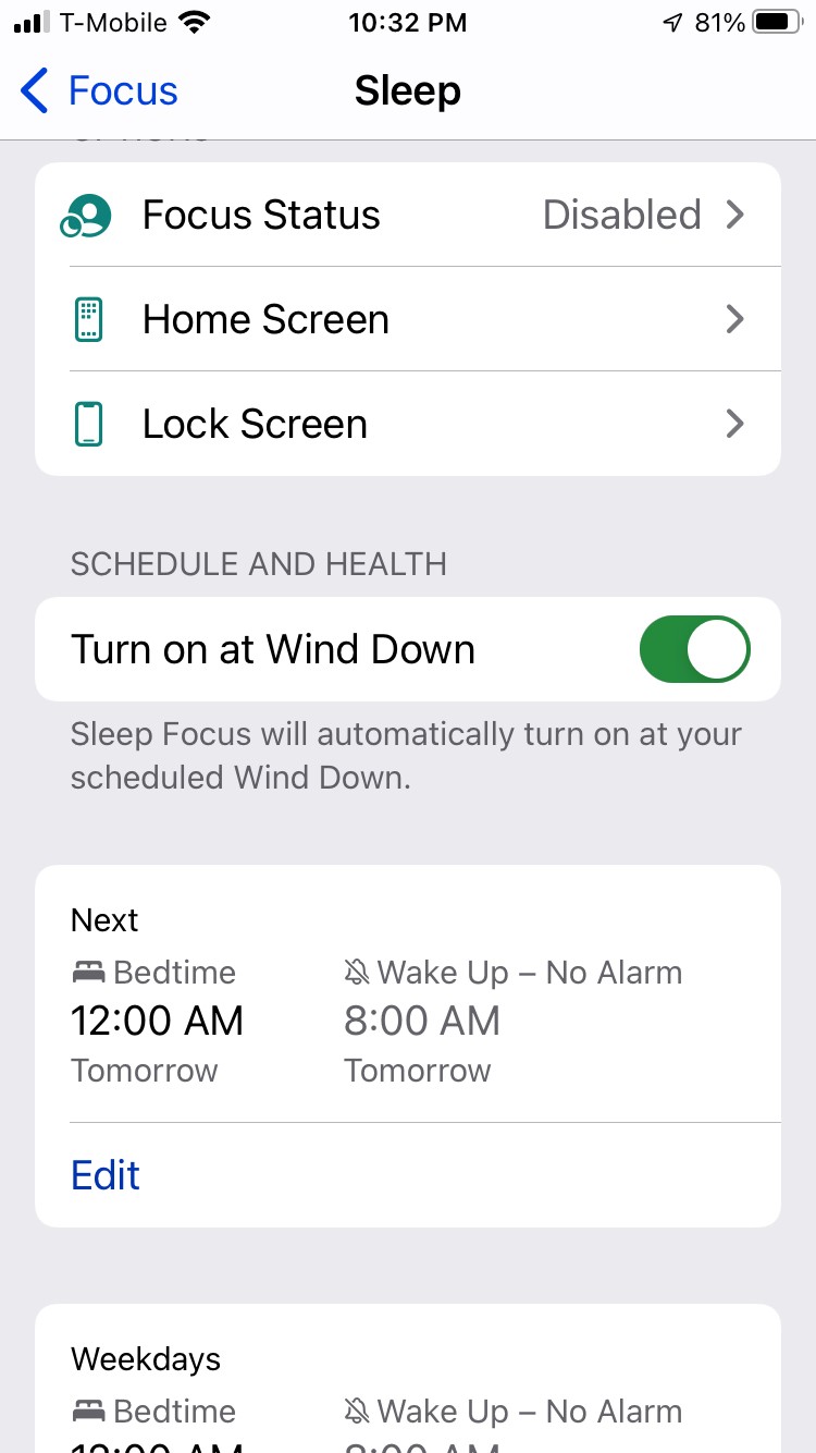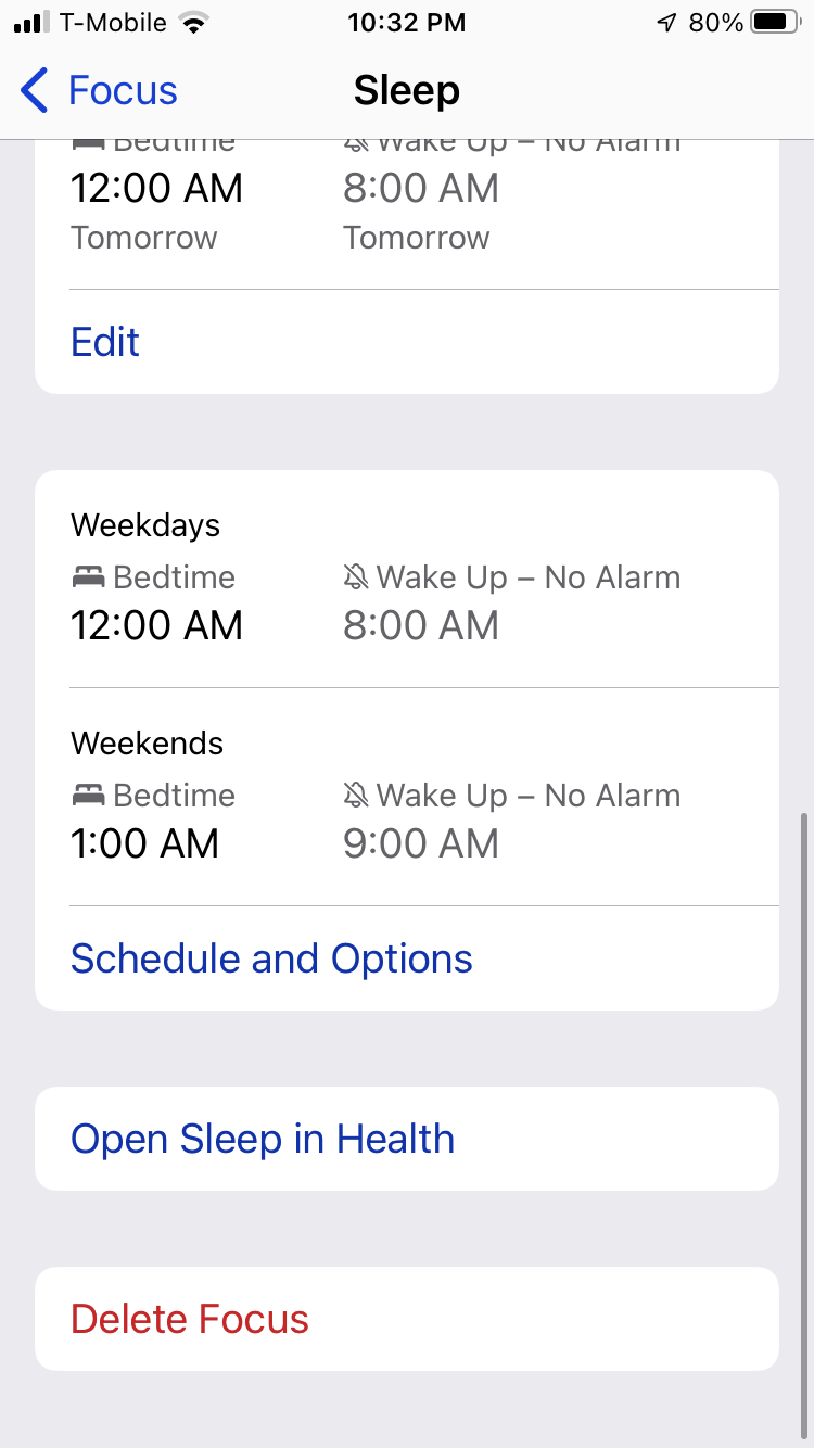 Settings are shared between devices. Both are set to the same time zone, logged into the same Apple/iCloud account. I will even get a tap notification on my Apple watch about a text message, while at the same time NOT getting a notification on my MacBook Pro, because the MBP thinks I should still have Sleep focus on. But looking at the Focus icon shows that the OS thinks Sleep should stay on until 8am... even when the system clock shows it's past 8am. I'll include some screen shots, plus shots of my MBP settings and my Health App/Sleep settings on my phone.