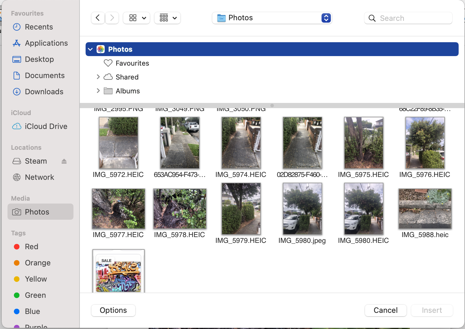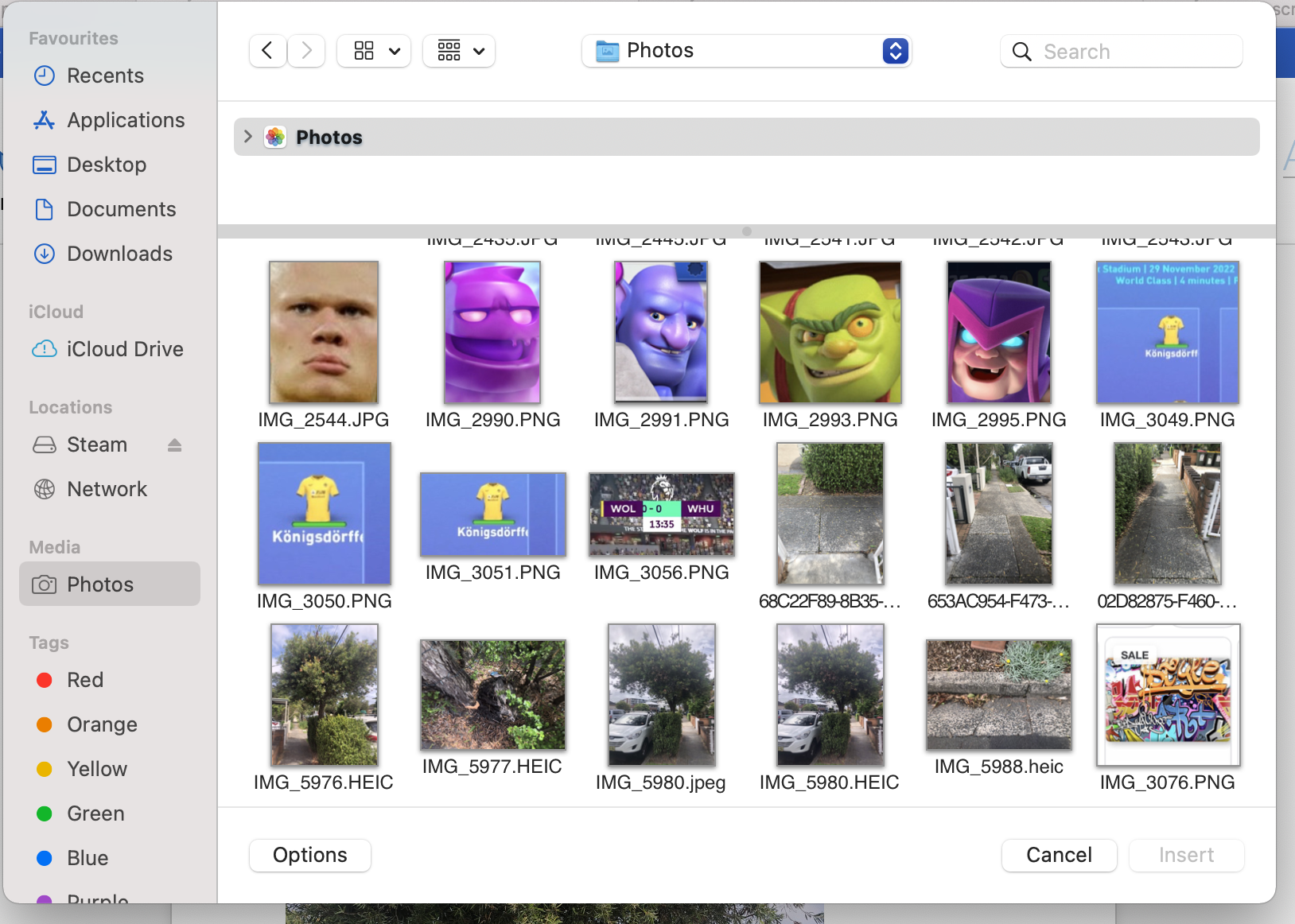 I am new to a Mac but have been trying to do this for 3 days now!! I want to insert a photo from my photo library into a word doc, however when I click insert photo from file and select photo's I am only given a small choice of the photos available to me. Why can't I see all the photos that are in my library?