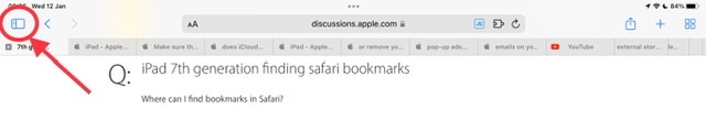 If using iPadOS15, tap the blue Safari sidebar icon at top-left of the screen - then select Bookmarks:
