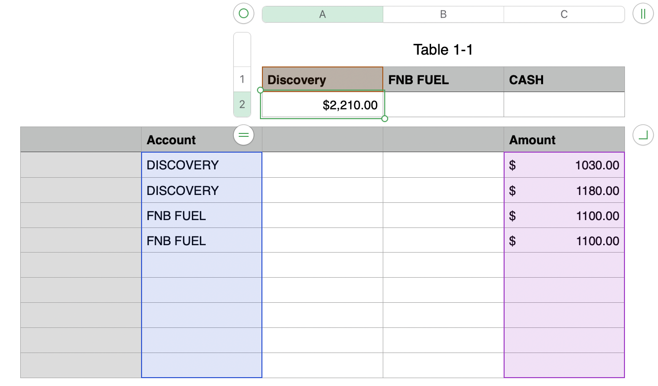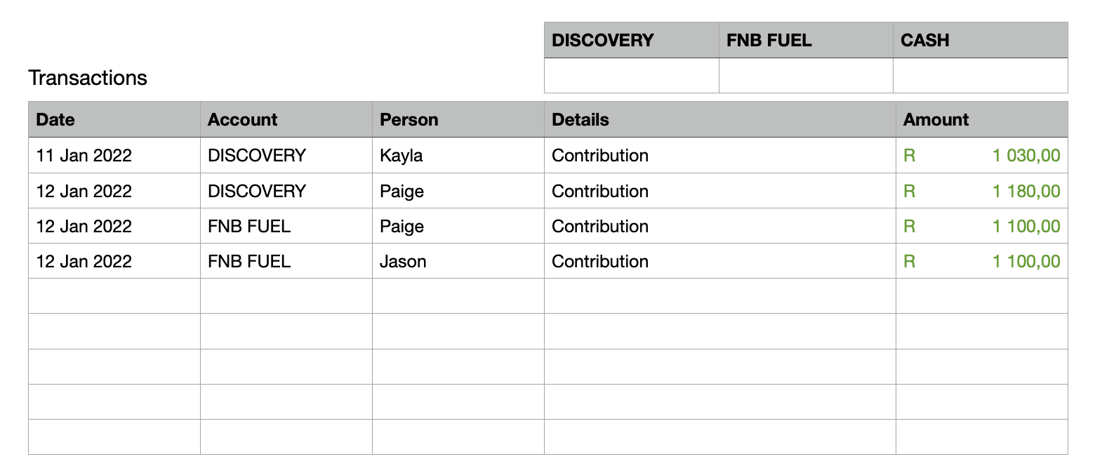 The table on top (with header row DISCOVERY; FNB FUEL; CASH) must show us the balance of those accounts. The table on the bottom (with title TRANSACTIONS) is our transaction history.