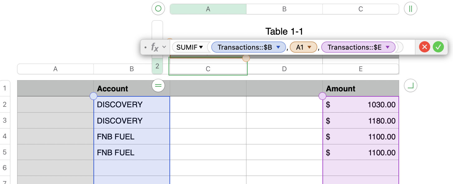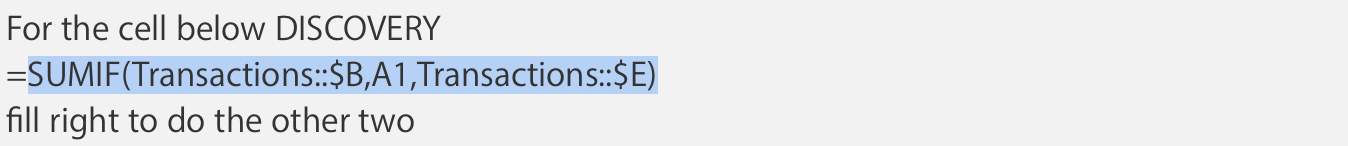 =SUMIF(Transactions::$B,A1,Transactions::$E)