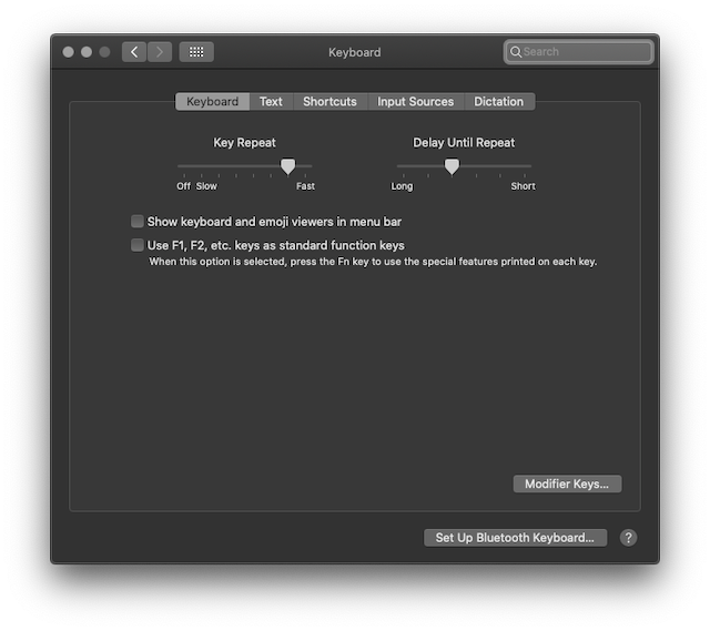 looked at systrem preferences, keyboard then keyboard tab. I have Key repeat / Delay Until Repeat & a checkbox that says Show keyboard and emoji in menu bar. There is no option to uncheck 'Use F1, F2 etc' I am Catalina10.15.7 (i cannot go any higher)