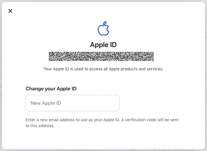 Click the Change Apple ID button that appears. If you wish, also change the password and 2FA (Account Security) entries. Follow the instructions sent to the new email address to confirm the change.