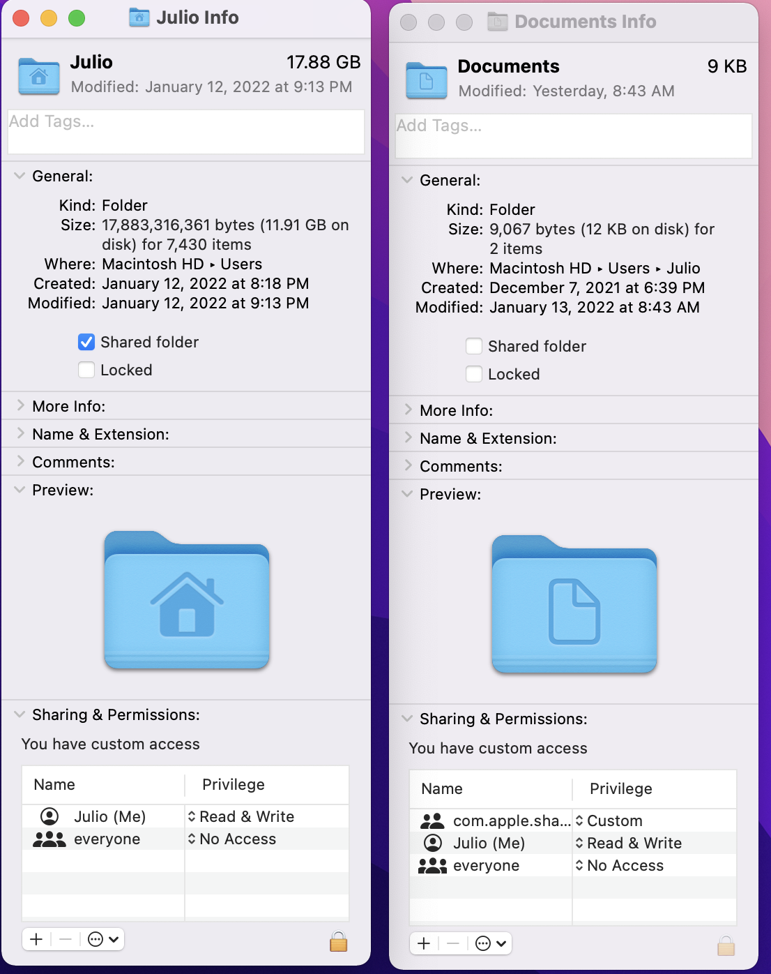 - When opening Finder and selecting Getting Info on "Documents" folder under "Julio", the Shared folder box is not checked (tried checking documents but it didn't make a difference other than adding the "Documents Folder" to the list of folders under Shared Folders.