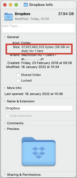 When I look up the 'Get Info' for the dropbox folder, it says "39.74GB for one item"....