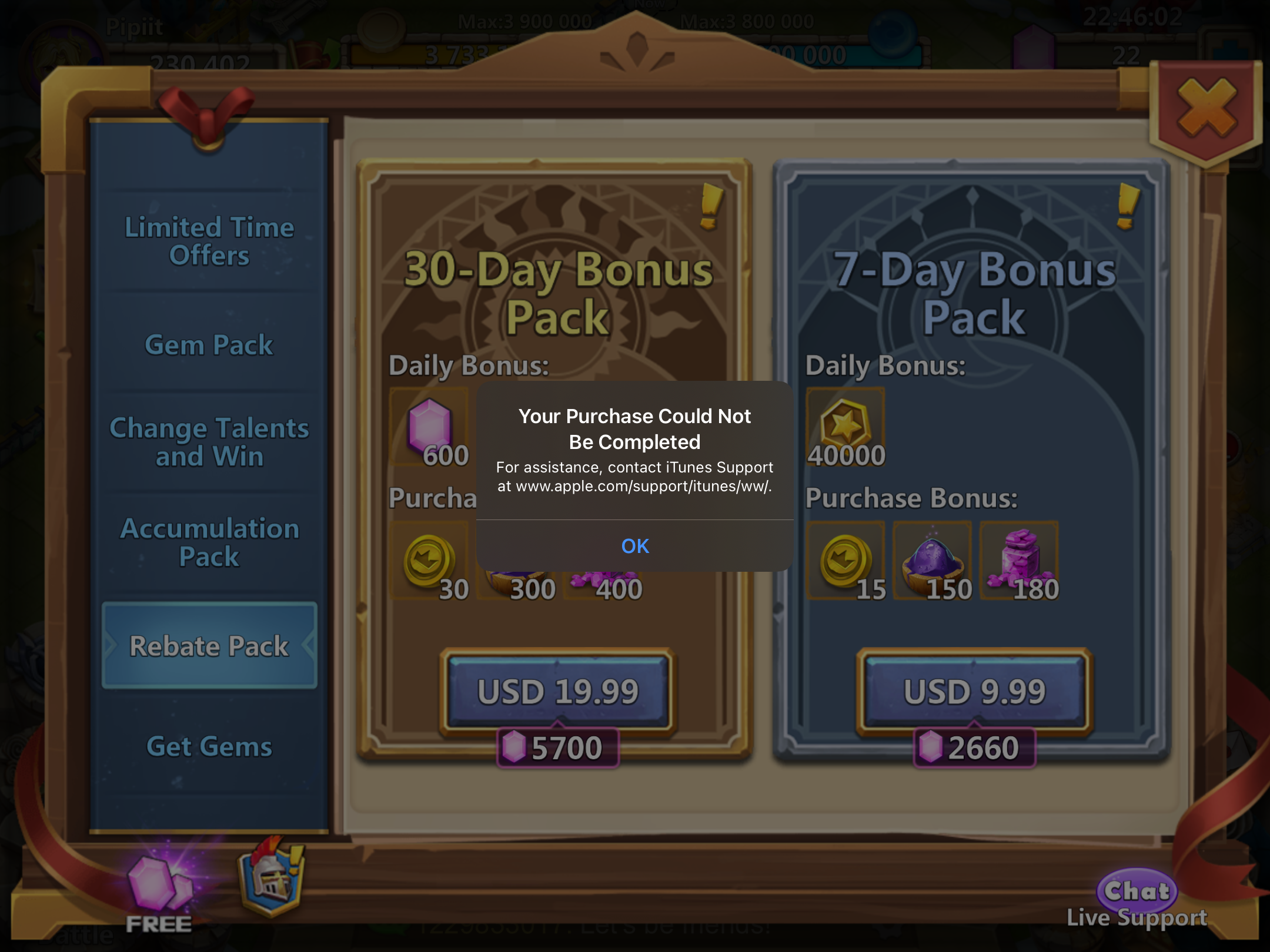 Cannot purchase in castle clash , already have itunes $25.00 , want to pruchase $19.99 on castle clash but it cannot purchase