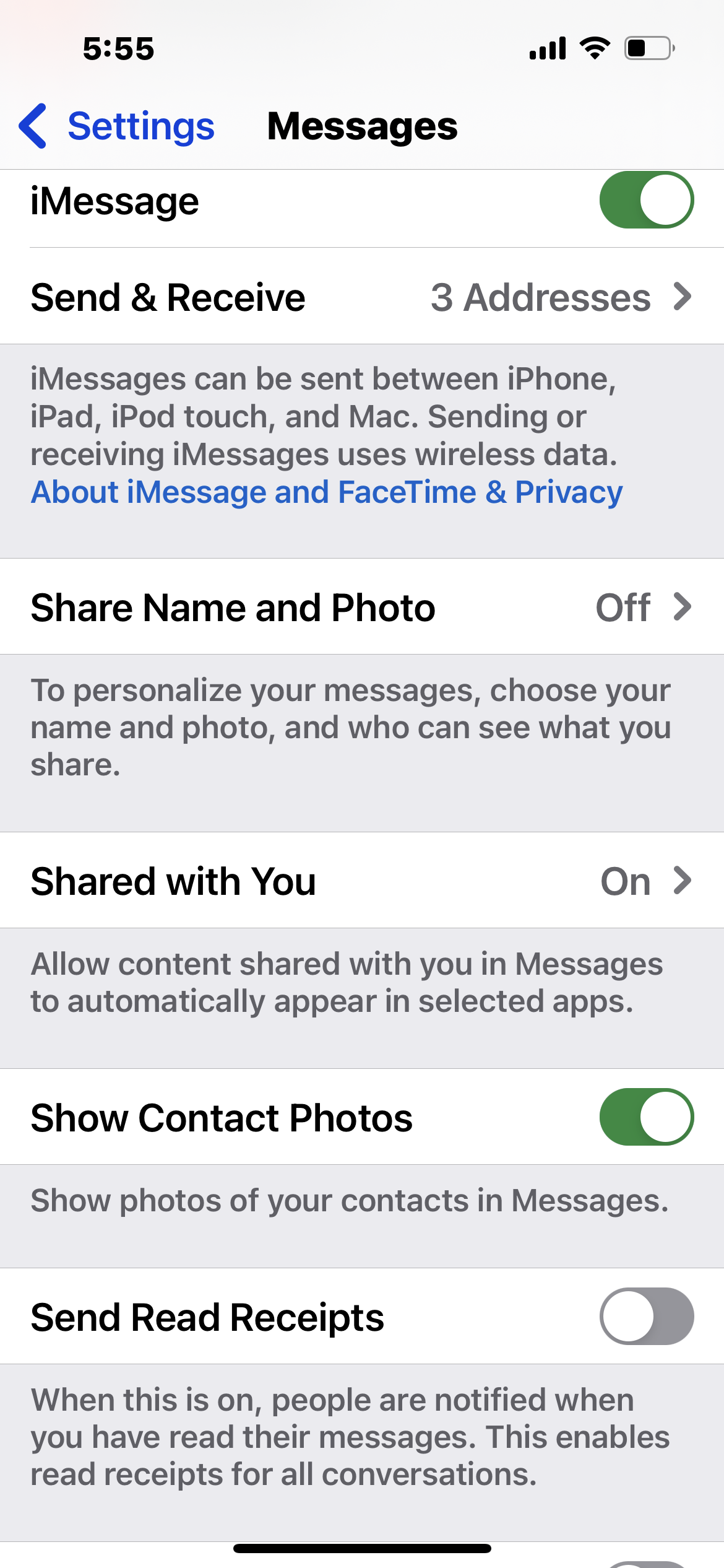 Also below photos of iPhone-->settings--> messages-->send receive and the 2 emails AND my phone number is shown.