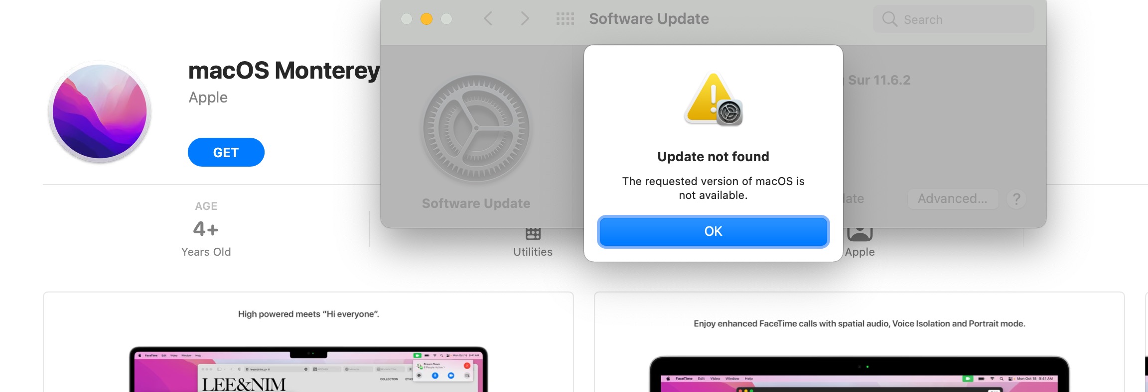 ...but when I click 'Get' on the App Store I am taken to the Software Update preference panel and then told "Update Not Found".