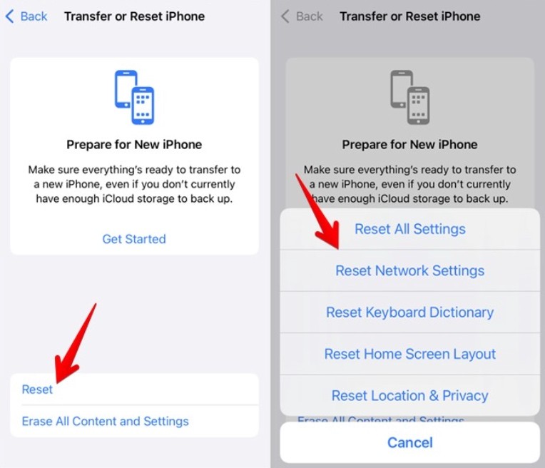 If this doesn't work, you can try resetting your network settings. Of course, you would want to back up your phone. You would go to Settings > General > Transfer or Reset iPhone > Reset. Doing this will remove any of your currently saved Wi-Fi passwords, VPN settings, Bluetooth connections, and other network-related settings.