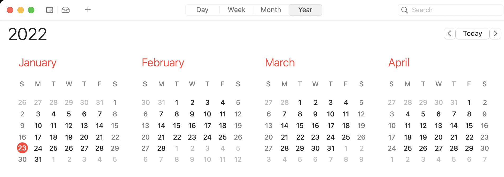 It can display a full year's calendar, with today highlighted, as shown below (screen shot here includes only the first row of months), or a single month, a week, or a single day, by clicking the buttons with those labels. In each setting, the < and > arrows will mve to the "next page" relative to the current display setting, and Today will bring the view back to the current date, displayed in the current setting.