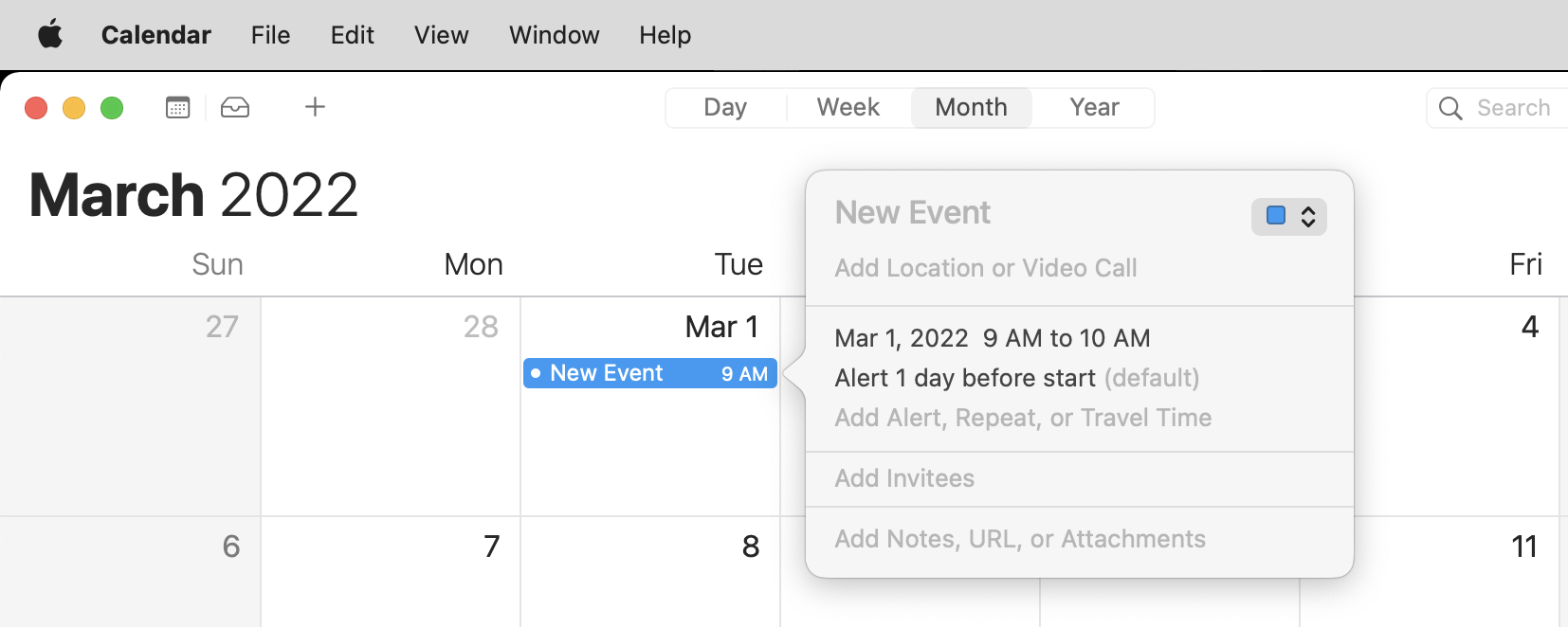 A double click on the date in the month opens a form on which you can enter an event on that date, and set Calendar to post a reminder to you on or before that date.