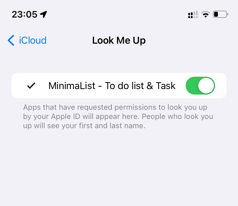 How to toggle this off? I know things in “Look me up” can’t be deleted, but I only want to turn this off. It’s always on as soon I leave this this screen. I even downloaded this app again and tried that way but no luck. Is this an iCloud bug?