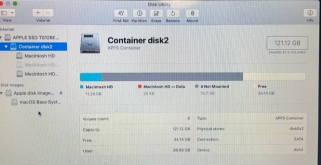 I have a MacBook Air 2012 that I am wiping so that I can sell. I want to make sure it's good and clean before I sell it. So I booted under Disk Utility and then I reset it to the factory settings. I had just updated it to macOS Catalina. Everything worked fine until I noticed that the data volume didn't change. There was still only 33GB free space and the rest was still there clogging up the computer. So I rebooted the computer again and deleted the data on it but not the whole volume as I was scared I was going to delete system files and wreck the computer. So, this is what happened. I still have 86.98 GB used and only 33.14 of free space, plus it added a disk image to the Disk Utility and under that, there is another folder that says macOS Base System. What is happening? What do I have to do to free up all the space and erase all my data so I can sell it? Please help me!