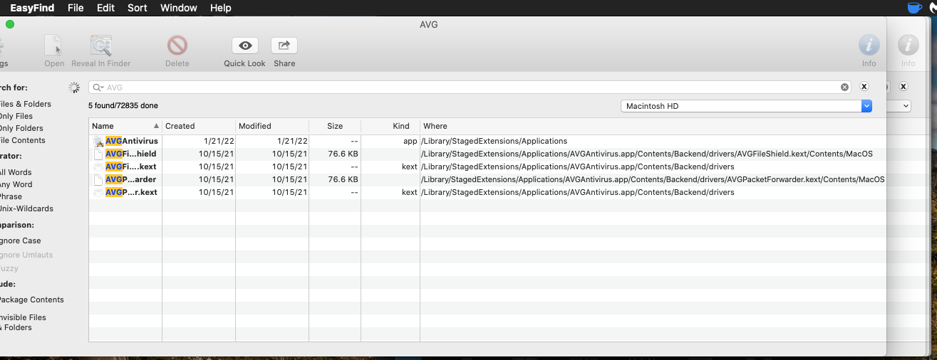 A new Finder window will open inside the above path and anything that suggests it is an Avast or AVG-related item can be dragged and dropped to the Trash. Expect a password prompt to do this and supply your administrator password. Do not remove the /Library/StagedExtensions folder as it is installed by macOS.