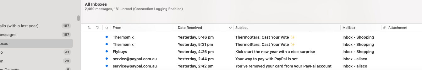 I have taken some screenshots during this process, where I had the same ‘All Inboxes’ selected throughout (and I didn’t do anything else in Mail during this time):