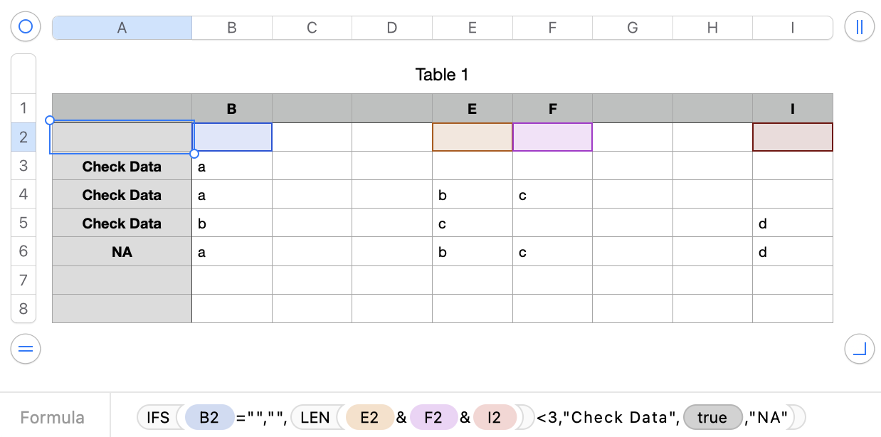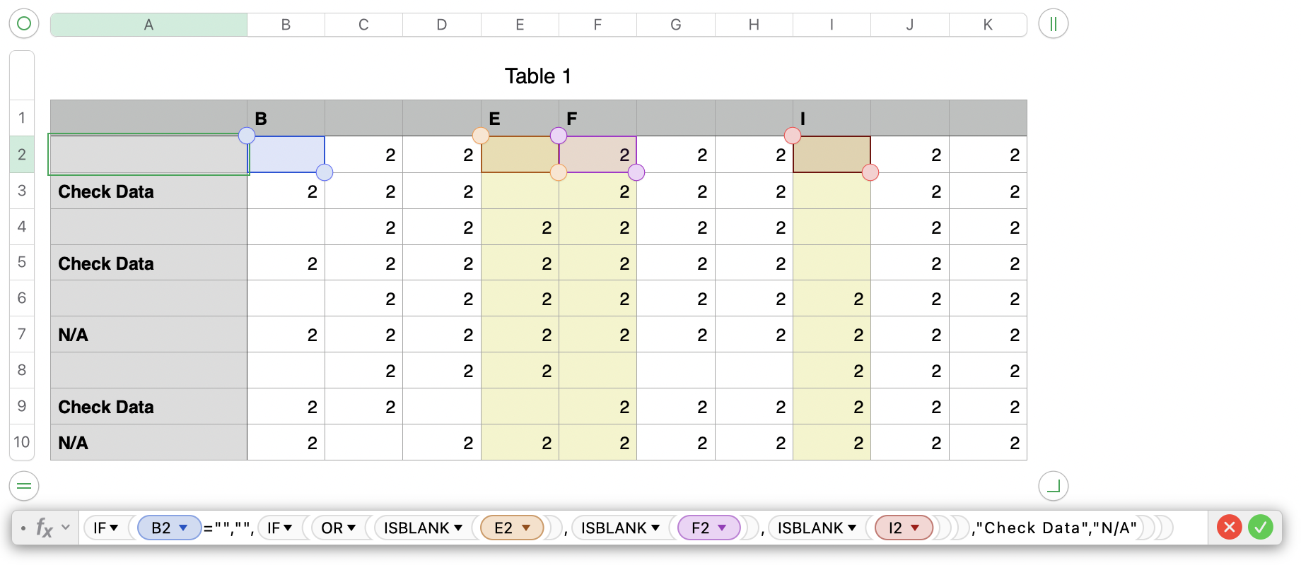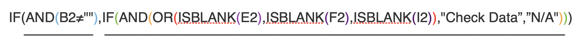 IF(AND(B2≠""),IF(AND(OR(ISBLANK(E2),ISBLANK(F2),ISBLANK(I2)),"Check Data”,"N/A")))