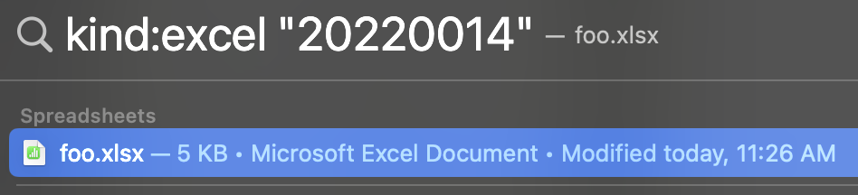 In this manner, you won't be asking Spotlight to search *all* filenames and their contents for that string, and focus it on just Excel files.