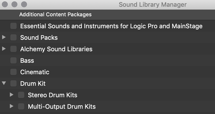 Logic Pro > Sound Library > Open Sound Library Manager > open "Drum Kit" and tick "Stereo Drum Kits" and / or "Multi-Output Drum Kits" to download the rest of DKD sounds.