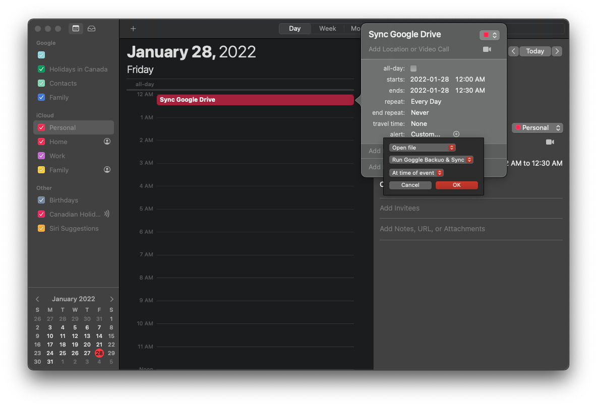 I have a Unix Executable File that I would like to schedule to run daily. I tried to create a shell command in automator to run through ical, but it failed to execute. I can run it manually, but I really need this to be an automated process that runs every night at like 1 am.