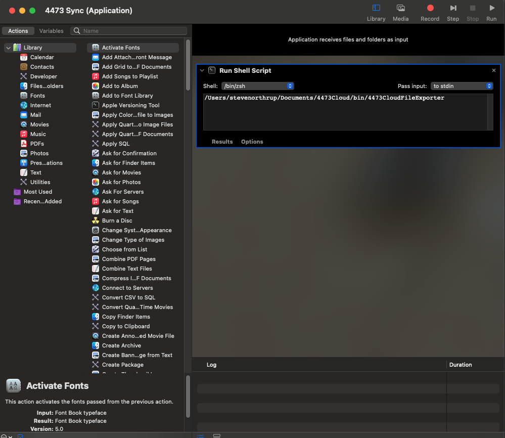 The shell used is the /bin/zsh shell, the pass input is to stdin, and the command is the path to the exec file. The exec file works fine if I click on it in finder or manually enter it in terminal. I can also "play" the application in automator and it functions fine. When I create the iCal task to open a file at time of event. it just doesn't do it.