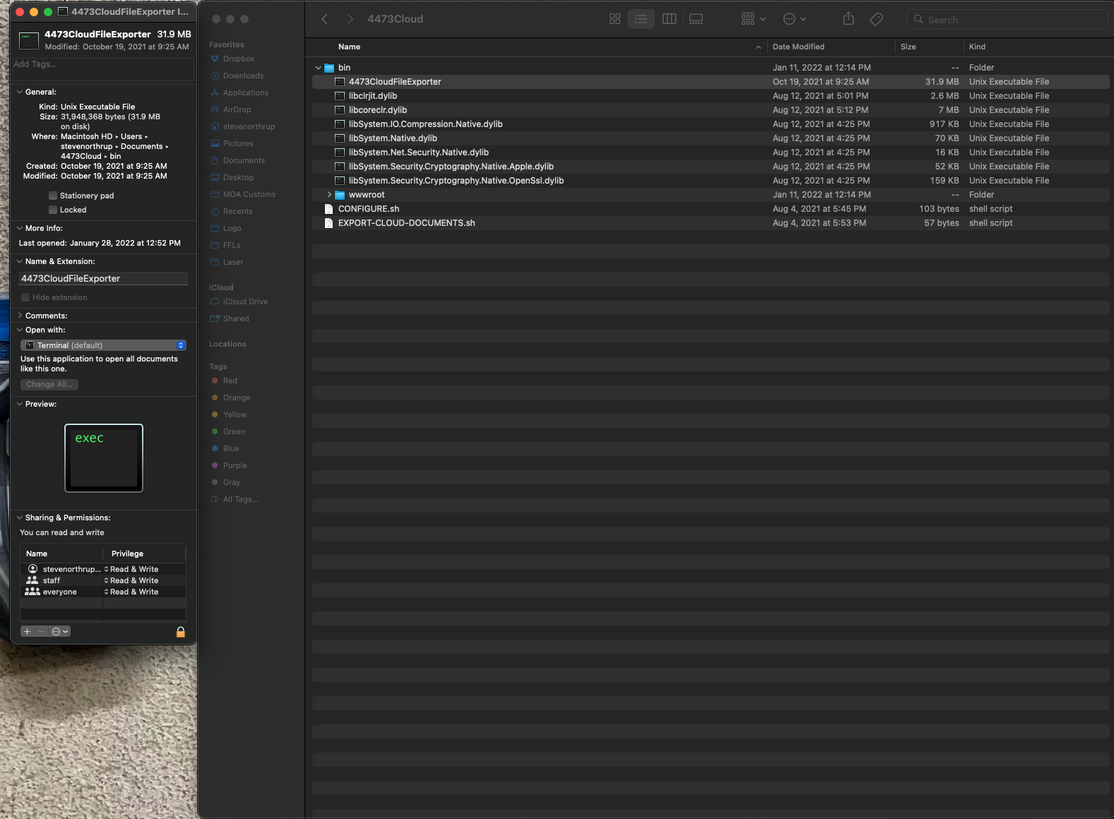 I have no idea at this point why this isn't working. The exec file will open and execute if I double click it in finder. I also created an automator app that will also open and execute just fine if I double click on it in finder. If I try to create an event in calendar to open the automator app once a day, it doesn't work. Also, I figured out how to edit cron to schedule, and again neither the exec or automator app will execute in cron. This is beyond frustrating.