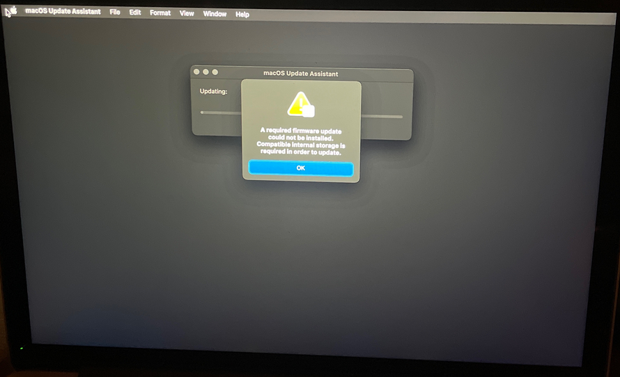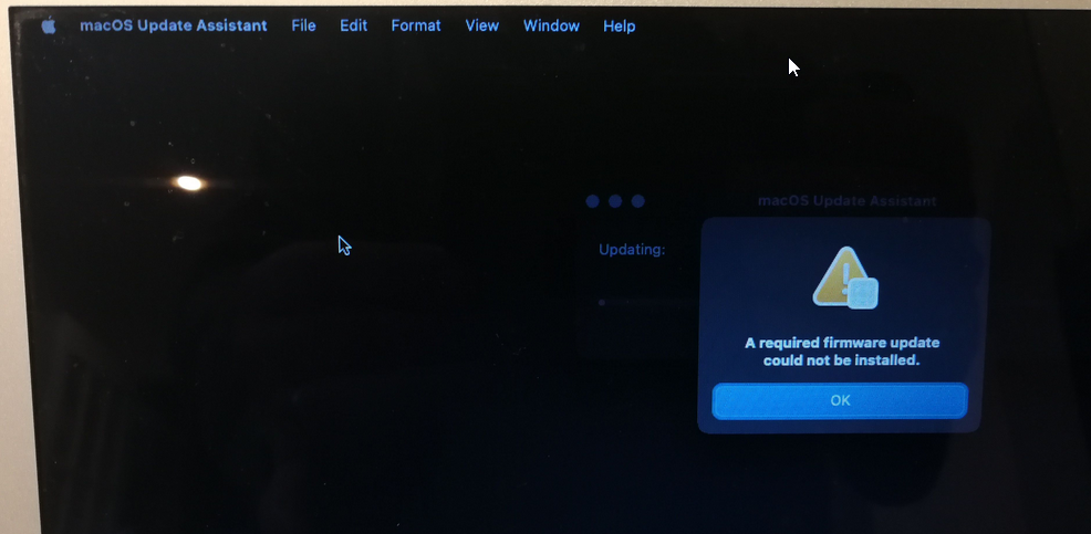 No matter what I try to install Monterey I get a black mocOS Update Assistant screen with a yellow warning triangle with the message "A required firmware update could not be installed."