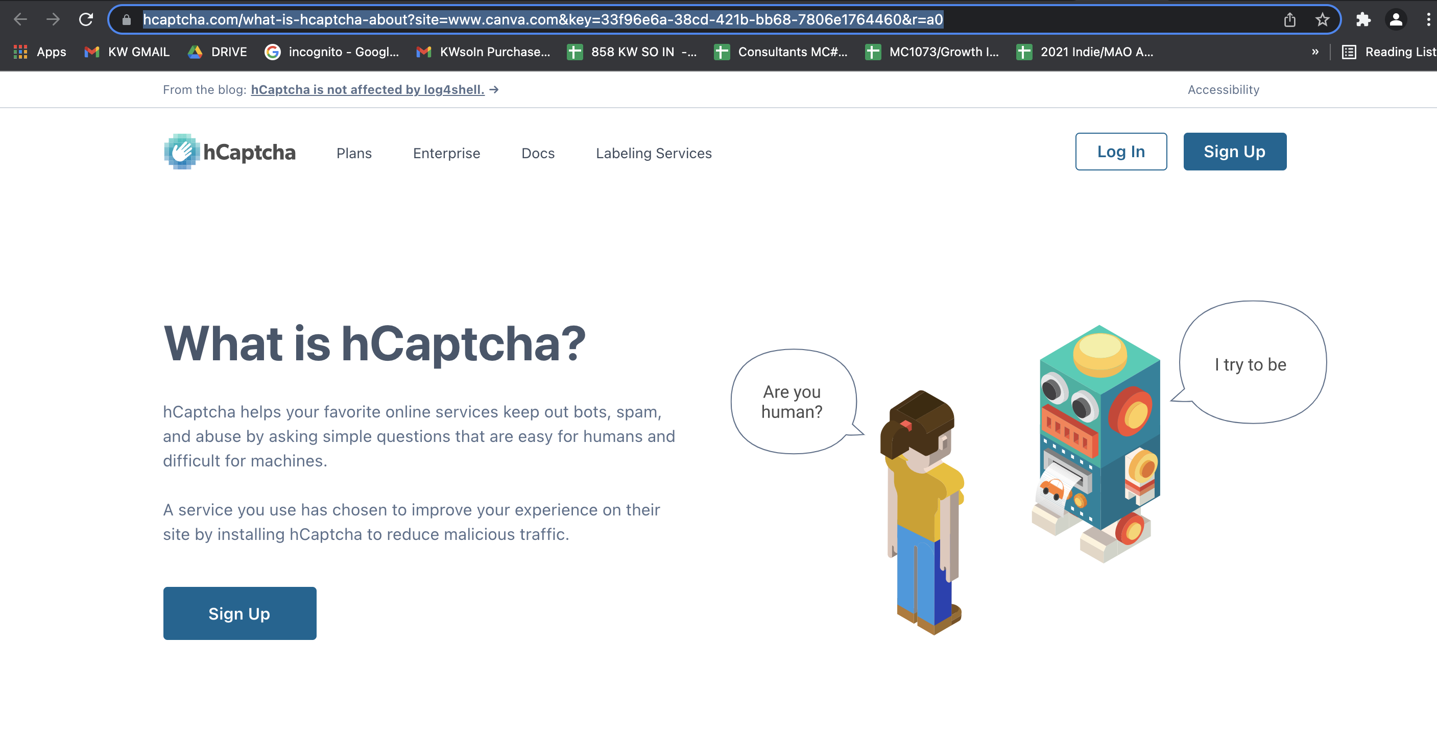 For weeks I have been unable to access certain websites like Canva and Pinterest, that I use daily for my business. Every time I try to access them on Safari, Chrome or Firefox from my macbook, I get a pop up asking me to check I am not a robot and it comes from this site ... https://www.hcaptcha.com/what-is-hcaptcha-about?site=www.canva.com&key=33f96e6a-38cd-421b-bb68-7806e1764460&r=a0
