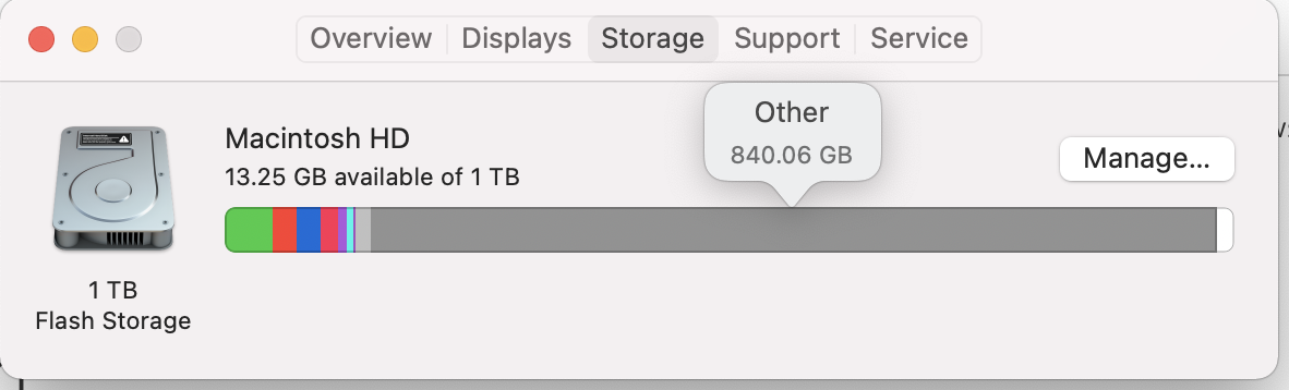 My 1TB MacBook Pro shows over 840GB of storage is taken "Other" category. I deleted all files/items that took significant amount of space but weren't needed as well as the dng files. I've done some research into what "other" is. I know cleaning Cache is one of the suggestions, but how am I to know which items are actually needed to run the machine and apps I use? Is there a comprehensive list of what is not needed to run the machine, and can be deleted? 840GB is a ridiculous amount of space, and there's got to be a way to clear most of it. Please help!