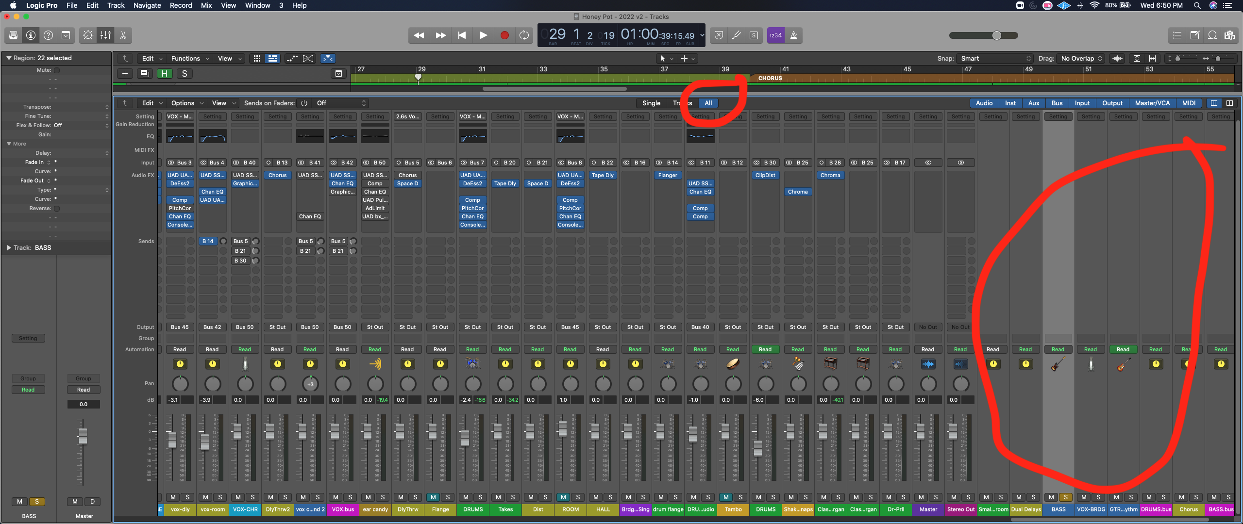When I'm in Mixer window, and click ALL, I can actually see the busses, but again, nothing is routed there and still missing all faders, plugins, etc. See second Screenshot with red.