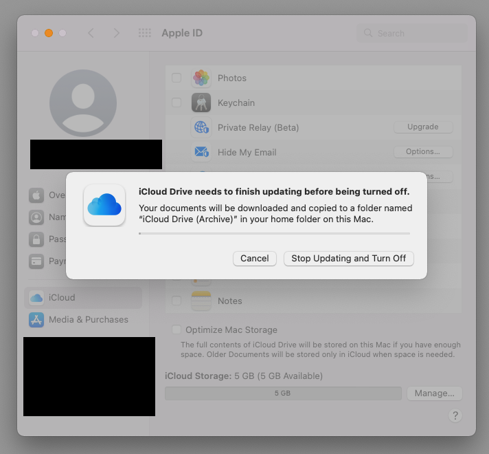 I don't want to use iCloud. I just upgraded to Monterey and Apple defaults to enabling iCloud (even though my prior settings had not used iCloud). I was able to uncheck all the boxes for things iCloud wants to upload from my iMac, including all the Options under iCloud Drive, except I am unable to uncheck "iCloud Drive" itself. When I attempt to do so, it brings up this dialog box, and neither of the options is clickable, and the progress bar doesn't budge. It just hangs, and I can't even quit System Preferences or Restart. My only recourse was to use Activity Monitor to Force Quit System Preferences. Even then, the iCloud Drive checkbox remains checked. I don't know if any data was uploaded to iCloud in the short time from signing in to my Apple ID to unchecking all the boxes I could.