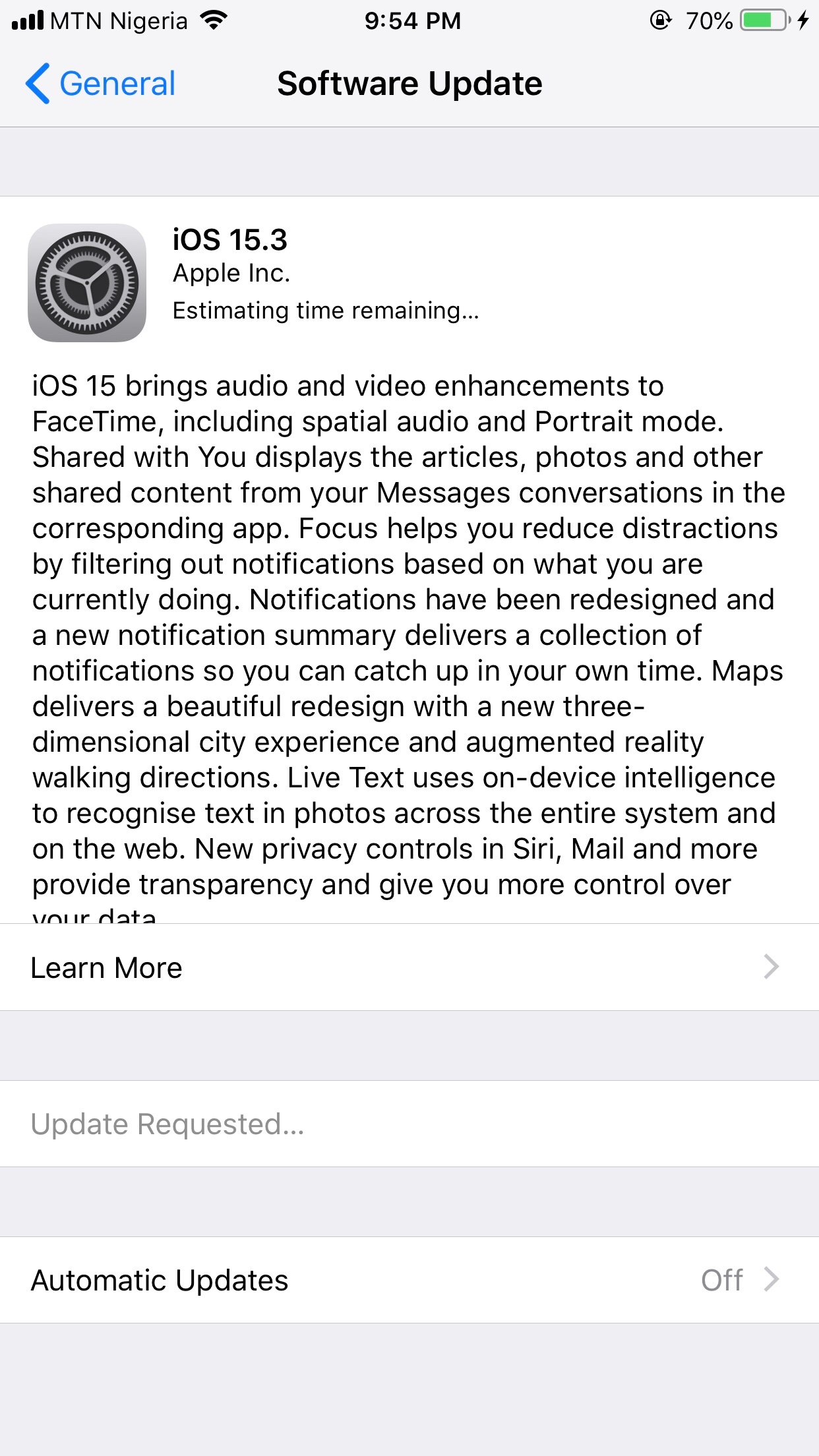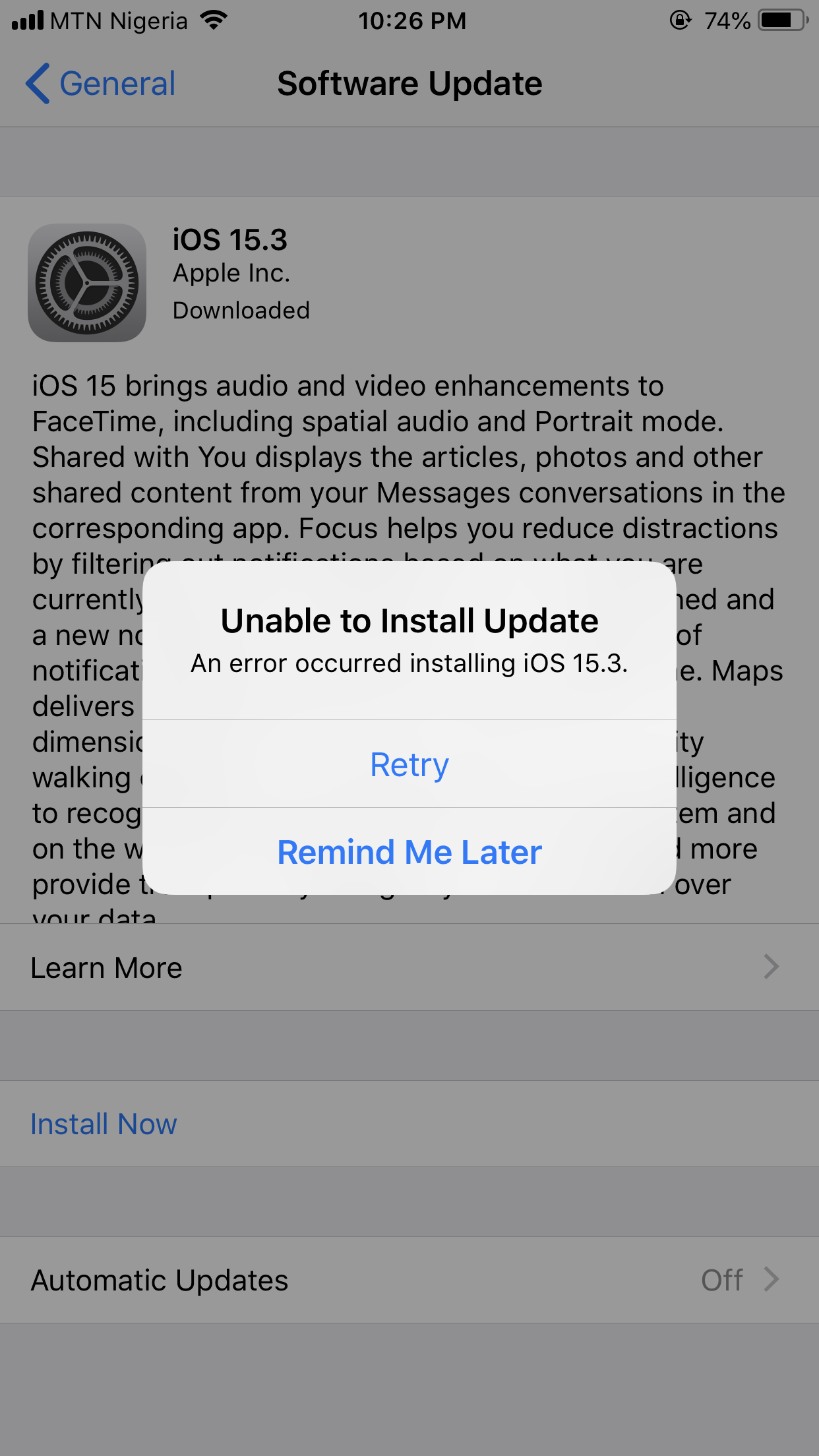 I tried to update my iOS to 15.3, once I clicked on Install updates, it showed “verifying “ and after that the screen displayed “An error occurred “