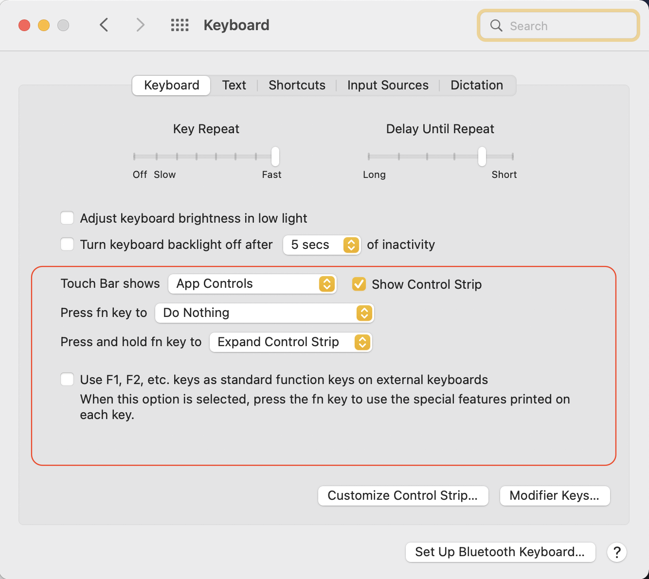 How does one return to one’s Touchbar menu, when it has changed to keys:F1,F2,F3…etc?… I am unaware of a shortcut or key to “return to my default touch bar icons. I’m running iOS Monterey 12.2 . Please help?