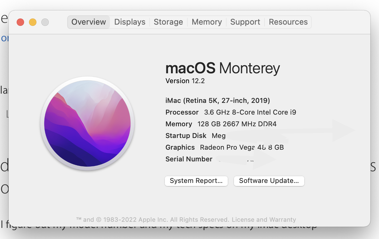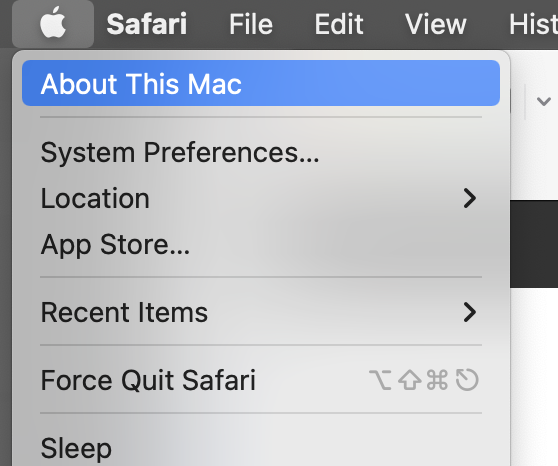 In the menu bar, click on the Apple logo at the far left and choose About this Mac from the drop down menu: